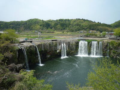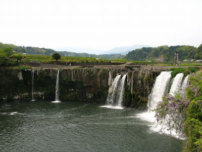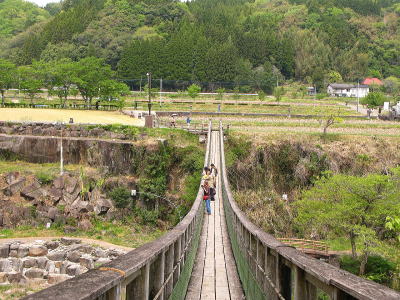 ![]() 滝周辺をぐるっと歩いて、最後に吊り橋から原尻の滝を 眺めた!畑に咲き乱れたチューリップもきれいだった! |