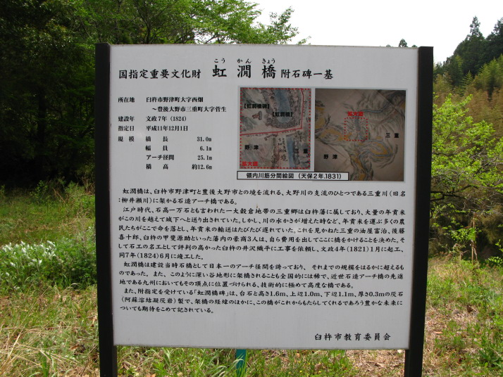 ![]() 読み方がわからなかった虹澗橋。「こうかんきょう」と 言うらしい!国の重要文化財に指定されている。 漢字からして虹はイメージできたのだが、ちょっと かけ離れていた・・・(泣)現在は、老朽化のため 自動車での通行は不可能。詳しくは左をクリック! |