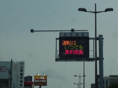 ![]() 「運転はいつでも真剣勝負」まさにその通り!! 疲れが出てきた中で、いいタイミングでこれを 見せられた気がする。やるなぁ〜宮崎県警察! |