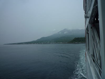 ![]() フェリーの上でようやく桜島が顔を出した。 |