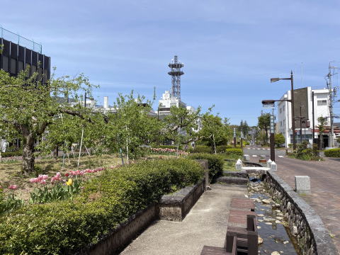 | タイトルの通り、りんごの実が輝いている。 道路公園のような歩道にりんごの木が植えられている。 顕彰プレートは交差点内にあり、人が通ると恥ずかしい!? |