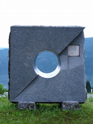 | 急峻な山岳地帯に囲まれ合掌の里を通る国道304号 五箇山トンネルは太平洋と日本海を結ぶ新たな動脈の象徴。 トンネルを抜け下りカーブ辺りの開けた場所に穴を空けた道碑が! |