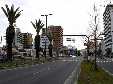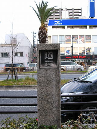 | 中央分離帯に植栽された125本のフェニックスが道路名の由来で 不死鳥の伝説になぞられて戦火の中から甦った堺のシンボル道路。 顕彰プレートはちょうど道の中間辺りか・・・このような広幅道路は いつもみつけるのに苦戦しているような・・・気のせいか!? |