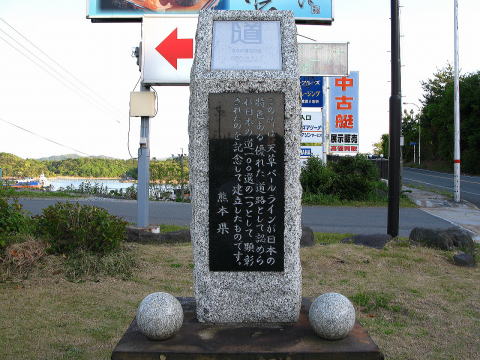 | 「天草五橋」は、宇土半島から大矢野島を経て、天草上島を 五つの橋で結ぶ連絡道路。総延長約17.4kmから眺める景色は 素晴らしく真珠養殖も盛んなことから「天草パールライン」と呼ぶ。 訪れた時は天気が悪かったにも拘らず、観る者を飽きさせない 景色!晴れた日に再訪し感動を味わいたい。 顕彰プレートは熊本側から天草諸島側に向けて走行し、 ちょっと忘れてしまったが橋の手前左側にあったような・・・ |